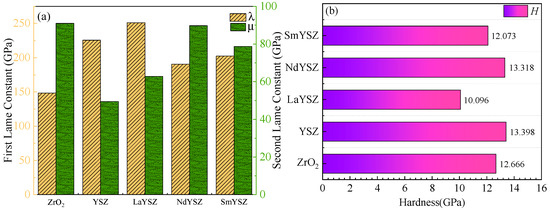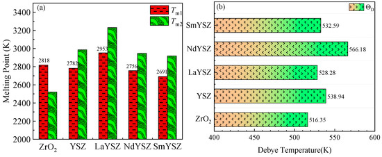 The melting points of the REYSZ materials were shown in Figure 9. The melting points of the REYSZ materials were 2521~3231 K, indicating that the materials could withstand working at higher temperatures and satisfied the requirement of high melting points of thermal barrier-coated ceramics, among which LaYSZ had the highest melting point. It was well-known that the Debye temperature of a material was closely related to the chemical bonding characteristics within the crystal; the stronger the chemical bonding, the higher the Debye temperature. According to the Debye theory, the characteristic Debye temperature originates from the thermal vibration of solid atoms and corresponds to the highest natural mode of oscillation of the crystal. As shown in Figure 9, it could be seen that the highest Debye temperature of NdYSZ was 566 K, indicating that the interatomic bonding of NdYSZ was the strongest among REYSZ.