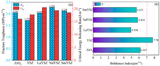 The fracture toughness value and critical energy release rate of the REYSZ materials were shown in Figure 8: The fracture toughness of the REYSZ materials was 1.722~2.283 MPa-m1/2. NdYSZ had the highest fracture toughness, and compared with the traditional YSZ materials doped with lanthanide rare earth elements, fracture toughness was improved, and with the increase in the atomic number of lanthanide rare earth, the material’s critical release energy gradually decreased, which meant that the crack expansion of the material needed to absorb a larger amount of energy, which further proved that the REYSZ material had good fracture toughness. As shown in Figure 8, the brittleness indices of REYSZ materials were lower than that of conventional YSZ (7.780 µm−1/2), which indicated that REYSZ materials had the ability to work for a long period of time in high-temperature environments. In summary, the hardness of REYSZ materials was 10.069–13.398 GPa, the fracture toughness was 1.722–2.283 MPa-m1/2, the critical energy release rate was 17.674–20.458 J/m2, and the brittleness index was 4.938–7.78 µm−1/2. Among them, the best overall mechanical properties were those of NdYSZ (hardness 13.318 GPa and fracture toughness of 2.283 MPa-m1/2), with good mechanical properties comparable to those of YSZ materials.