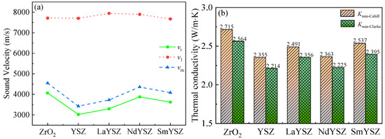 As shown in Table 6, the kmin values obtained by both the Cahill and Clarke models were relatively close to each other, indicating that it was feasible to predict the minimum thermal conductivity of REYSZ using the above model. The calculation results of the Clarke model were slightly lower than those of the Cahill model, which was because the Cahill model introduces the narrow range of freedom of phonons in the amorphous state to measure the thermal conductivity of the material. As shown in Figure 10, the lowest thermal conductivity of the REYSZ material was 2.355~2.715 W/m∙K, and the thermal conductivity of the NdYSZ material was very close to that of YSZ. The reason for this was, firstly, the structure of REYSZ was more complex, and there were many tilted Zr-O and RE-O polyhedral structures in the crystal structure of REYSZ in the tetragonal phase, and these highly complex structures reduced the symmetry within the system. As the ionic radius of the lanthanide rare earth elements decreases, the tilt of the RE-O polyhedron further increases, and the degree of distortion within the crystal lattice increases. Finally, the large differences in ionic radii, atomic masses, and charges led to the diversification of chemical bonding species and bond lengths in REYSZ and the intensification of phonon scattering, which ultimately produced low intrinsic thermal conductivity, and the low thermal conductivity values of REYSZ were favorable for its move towards practical applications.