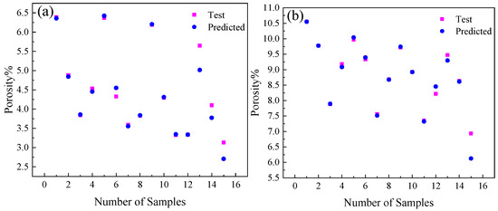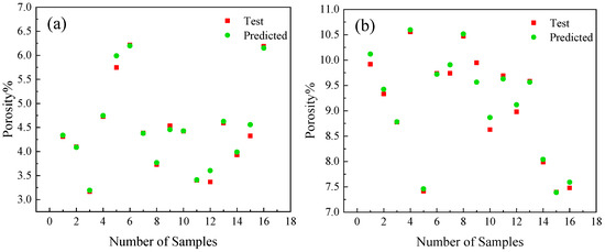 Scatterplot of fitting results for BP neural network output 1 (a) and output 2 (b).