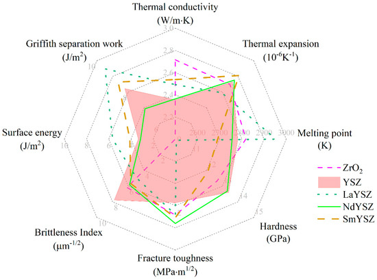 Under a high-temperature service environment, due to the mismatch of the coefficient of thermal expansion between the ceramic coating and the metal bonding layer, a large thermal mismatch stress would be generated at the interface, which contributed to the sprouting and expansion of cracks during thermal cycling, leading to the cracking and detachment of the ceramic coating in the direction parallel or perpendicular to the metal substrate, which seriously affected its service life. As shown in Figure 11, the thermal expansion coefficients of REYSZ materials were 6.773~7.432 × 10−6 K−1, in which both NdYSZ and SmYSZ have a better performance compared with the traditional YSZ, which was expected to be a new type of post-selected material for thermal barrier coatings. Although the doping of rare earth elements could improve the thermal expansion coefficient of thermal barrier coatings, it might also deteriorate other properties, so the effects of the valence, ionic radius, and content of the elements on the lattice of YSZ needed to be considered comprehensively. Calculations with the help of first nature principle modeling were an effective means of obtaining a suitable doping system, which was also one of the hot spots in the current research on the modification of YSZ material.