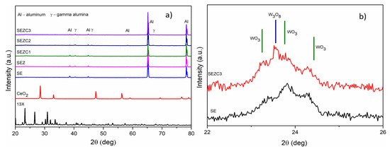 XRD patterns of oxide coatings prepared in all electrolyte solutions after 10 min of PEO processing are presented in Figure 2a. Powder XRD patterns of pure 13X zeolite and CeO2 are also presented in Figure 2a for comparison. As one can see from Figure 2, characteristic reflections of zeolite and CeO2 powder are not visible in XRD patterns of prepared oxide coatings, most probably as a result of their low concentration or good dispersion. Alongside, previously published articles which were focused on the incorporation of either zeolites or CeO2 into PEO coatings did not observe the reflections corresponding to these additives even up to concentrations of 10 g/L and 4 g/L, respectively [23,25]. For all prepared coatings only pronounced XRD maxima originating from Al substrate (COD 1512488) and low maxima originating from γ-Al2O3 (COD 1010461) denoted as Al and γ, respectively, are detected. Aside from these maxima, on high-resolution scan (Figure 2b), one can also observe a series of small maxima in the range from 23 to 25 degrees, which may be attributed to reflections corresponding to WO3 (COD 1010618) and non-stoichiometric phase W3O8 (COD 2101050) [26]. Observed reflections can be attributed to d001 = 3.820 Å, d020 = 3.740 Å, and d200 = 3.640 Å interplanar spacing in WO3, while W3O8 reflection corresponds to d001 = 3.774 Å.