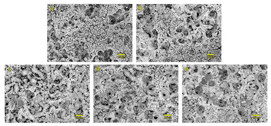 Figure 3 shows top-view SEM micrographs of coatings created during a 10 min PEO process. Surface morphology of all PEO coatings prepared in this study is similar to each other. Most notable differences between the micrographs presented in Figure 3 are related to the presence of cracks in coatings with lower concentration of particles in electrolyte solution (Figure 3a,b) and appearance of nodules on coatings with the higher concentration of particles in electrolyte (Figure 3c–e). Appearance of cracked coatings is inherent to PEO processing, especially when prepared coatings are thin [11]. Conversely, the appearance of nodules may be related to increased concentration of particles and inert incorporation of particles on top of the formed coatings [12]. To further analyze the surfaces of prepared PEO coatings a set of EDS analyses is conducted (Table 2).
