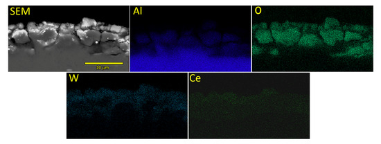 EDS mapping of cross-section corresponding to the sample SEZC3 is presented in Figure 6. Utilized EDS attachment was not able to quantify the concentration of Ce detected in the cross-section, but Ce EDS map is shown in Figure 6 demonstrating that Ce is detected, but its concentration is below the detection limit of the system. All other detected elements, except Al, are evenly distributed through the formed PEO coating, while Al concentration is somewhat higher closer to the substrate.