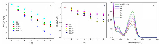 (a) Photodecomposition of MO after 6 h of irradiation with simulated sunlight; (b) absorption of MO in the dark; (c) MO degradation absorbance spectra for SEZC3 sample.