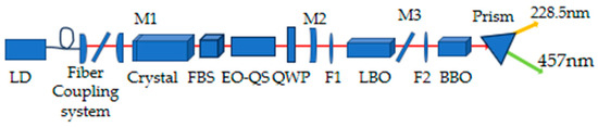 Figure 1 illustrates the experimental setup employed in this study, which features a straight-cavity design aimed at maximizing the reduction in the cavity length, thereby minimizing the output light pulse width. The pump source consists of an 808 nm fiber-coupled laser diode (LD) with a core radius of 200 µm and a numerical aperture of 0.22, capable of delivering a maximum continuous-wave (CW) power of 110 W. The pumping light is focused using a 1:1 coupling lens assembly and subsequently injected into the Nd:YVO4 crystal. To mitigate thermal effects and enhance system stability, a polarizer coated with an 808 nm high-transmission film is positioned between two plano-convex lenses of the coupling lens assembly, reflecting the p-polarized light that interferes with the experiment. Simulations and experimental tests indicate that the gain benefit of Nd:YVO4 crystals increases significantly within the 1 to 4 mm range, stabilizing beyond 5 mm. Additionally, reducing the doping concentration can decrease the reabsorption loss of the crystal to a certain extent; thus, a 4 mm × 4 mm × 5 mm a-axis-cut Nd:YVO4 crystal, doped at 0.1%, is ultimately selected as the gain medium, with water cooling employed to maintain the temperature at 22 °C. To further reduce cavity length and prevent mode competition, high-transmission coatings at 1064 nm and 1342 nm are applied to both sides of the crystal to suppress light gain at these wavelengths. The left end face (M1) is coated with an 808 nm high-transmission film and a 914 nm high-reflection film, while the right end is coated with high-transmission films at 914 nm, 1064 nm, and 1342 nm, thus eliminating the need for a total-internal-reflection mirror. The output mirror M2 is a planar concave mirror with a radius of curvature of 100 mm and a transmission rate of 9% for the 914 nm light. The polarizing beam splitter (PBS) features a high-transmission coating optimized for 914 nm on its surface. The cemented surface is treated with a film that facilitates the transmission of p-polarized light while reflecting s-polarized light at 914 nm. The quarter-wave plate (QWP) is similarly coated with a high-transmission film at 914 nm. The electro-optic Q-switch (EO-QS) utilizes a BBO crystal, which is selected for its high extinction ratio and resistance to deliquescence. A high-transmission film at 914 nm is applied to the end face of the BBO crystal to minimize the loss of fundamental-frequency light. A convex lens focuses the 914 nm fundamental light into the LBO crystal, while F1, a 914 nm focusing mirror with an anti-reflective coating and a focal length of 30 mm, assists in this process. The LBO crystal, measuring 4 mm × 4 mm × 15 mm, has both end faces coated with anti-reflective films at 457 nm, 914 nm, and 1064 nm. The oscillation wavelength of the cavity is set at 914 nm. Upon frequency doubling in the LBO crystal, a 457 nm wavelength is emitted from mirror M3. This mirror, positioned at a 45° angle, acts as a low-pass filter, redirecting the unconverted long-wavelength light emitted from the LBO while maintaining the trajectory of the 457 nm light. F2 is a 457 nm focusing mirror, also with an anti-reflective coating and a focal length of 30 mm. The BBO crystal is positioned near the focus for frequency doubling, with its two end surfaces coated with anti-reflective films designed for wavelengths of 457 nm and 228.5 nm. Through frequency doubling in the BBO crystal, 228.5 nm ultraviolet light is produced. Finally, a prism is employed to separate the 457 nm and 228.5 nm laser beams.