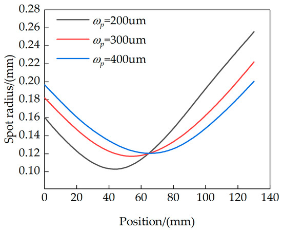 where dn/dT is the coefficient of the change in refractive index with temperature; is the crystal length; kc is the thermal conductivity; wp is the pump beam radius; pph is the thermally induced power; and a is the absorption coefficient. According to Formula (1), the thermal focal length was calculated for different pump powers when the pump spot radius was set to 100 μm, 200 μm, and 300 μm. The thermal focal length values corresponding to the 37 W pump power for these three pump spot radii were then incorporated into the parameters of the straight cavity structure. By combining the ABCD matrix with the stability conditions of the cavity, the spot radius at various positions within the cavity was computed using MATLAB R2023b simulation. The results are presented in Figure 2.