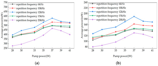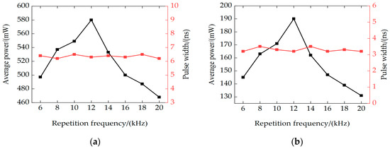 Pulse width and average power at different repetition frequencies: (a) the relationship between average output power and pulse width of 914 nm light at different repetition frequencies; (b) the relationship between average output power and pulse width of 457 nm light at different repetition frequencies.