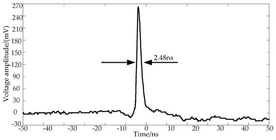 Nonlinear frequency doubling theory indicates that the efficiency of frequency doubling is directly correlated with power density. An increase in power density, along with a longer frequency-doubling crystal length, enhances conversion efficiency. However, BBO crystals exhibit a walk-off angle, and a focused light spot that is excessively small can diminish the effective interaction length. The 457 nm light possesses linewidth and divergence characteristics, and utilizing a frequency-doubling crystal that is overly long may lead to phase mismatch. In light of these attributes, the experiment was conducted at a repetition frequency of 12 kHz. Prior to initiating the experiment, we calculated the power density and the corresponding Rayleigh length at the focal point of lenses with focal lengths of 15 mm, 20 mm, 25 mm, 30 mm, 35 mm, 40 mm, 45 mm, and 50 mm. Following the optimal focusing conditions established by Boyd and Kleinman, an appropriate position was chosen for the placement of the focusing mirror and BBO crystals with lengths of 8 mm and 10 mm [24]. A beam quality detector was employed to assess the spot size, calculate the divergence angle, locate the position of the laser beam waist, and continuously adjust the angle of the BBO crystal to validate the theoretical results. Ultimately, when the injection power was set at 37 W and the repetition frequency was maintained at 12 kHz, an optical output of 228.5 nm was achieved, yielding between 13 mW and 32 mW. When the focal length of the focusing mirror was 30 mm, the maximum power light output reached 32 mW, with the narrowest pulse width measured at 2.48 ns, resulting in a light-to-light conversion efficiency of 16.8%. Figure 5 illustrates the single pulse waveform and pulse width of the 228.5 nm output light under conditions of 37 W pump power injection and 12 kHz repetition frequency.