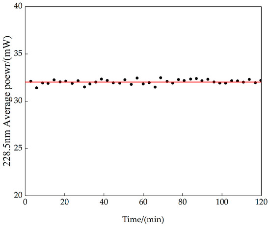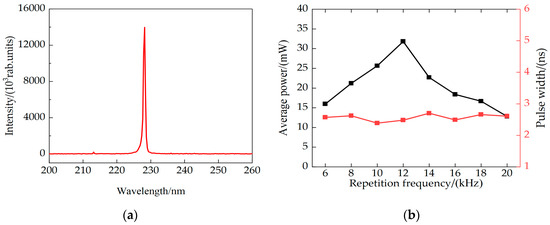 The light spectrum was measured using the OCEAN OPTICS HR4000CG–UV–NIR spectrometer (Ocean Optics, Inc., Dunedin, FL, USA), which possesses a resolution of 0.7 nm. The spectrum of the 228.5 nm deep-ultraviolet (DUV) light was obtained at a repetition frequency of 12 kHz, as shown in Figure 6a. Figure 6b illustrates the relationship between the average output power and pulse width of the 228.5 nm deep-ultraviolet light in relation to the repetition frequency.
