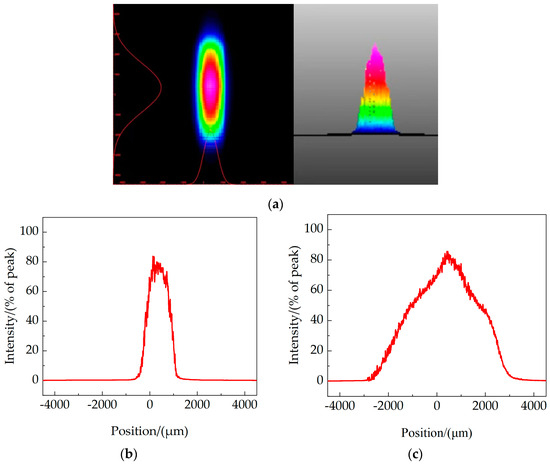 In this experiment, it is essential to adjust the rise response time of the electro-optic Q-switch to ensure frequency stability. We employed the BP209/VIS beam quality analyzer (Thorlabs GmbH, Bergkirchen, Germany) to obtain the beam profile of the 228.5 nm ultraviolet light, which displayed an elliptical beam spot with a horizontal-to-vertical ratio of 1:4. This elliptical shape was attributed to the significant walk-off angle of the BBO crystal. The intensity distribution of the 228.5 nm beam spot is illustrated in Figure 7a. Figure 7b,c display the intensity distributions of the 228.5 nm light along the X-axis and Y-axis, respectively. It is evident that for the contour of a Gaussian beam, the irradiance decreases as the distance from the center increases.