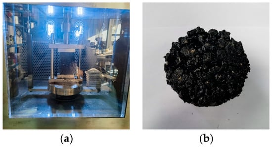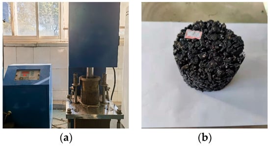 It is essential to select reasonable mixture performance indicators to accurately evaluate the effects of physical cooling on the performance of porous asphalt mixtures. Splitting tensile strength is one of the most important performance evaluation indicators of asphalt mixtures. In the curing stage of cold recycled asphalt mixtures, splitting strength is used as a key performance indicator to determine the time before opening to traffic [,,]. Raveling is one of the most typical forms of diseases in porous asphalt pavements, and it is also the most important factor affecting the service life of porous asphalt pavements [,,]. Therefore, the splitting tensile strength and raveling loss were employed as key performance indicators for porous asphalt mixtures. Splitting strength was tested according to T0716-2011 in the Chinese standard JTG E20-2011 [], and the calculation formula is shown in Equation (1). The raveling loss was tested according to T0733-2011 in the Chinese standard JTG E20-2011 [,], and the calculation formula is shown in Equation (2). The splitting test and raveling loss measurement are shown in Figure 3 and Figure 4, respectively.