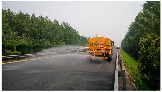 The porous asphalt mixture is obtained by mixing high-viscosity modified asphalt, coarse and fine aggregates, mineral powder, and additives in a certain proportion. During the mixing process, the high-viscosity modified asphalt and the coarse and fine aggregates need to be heated. Generally, the temperature of the freshly mixed porous asphalt mixture is between 170 °C and 185 °C []. When the porous asphalt mixture is paved on the road surface and rolled, the pavement surface temperature is between 70 °C and 80 °C. There is still a gap from the pavement surface temperature lower than 50 °C. The time required for the pavement surface temperature to drop to the specified level varies with the ambient temperature, and it generally takes 2 h to 6 h []. In the hot summer, it is even difficult for the pavement surface temperature to drop below 50 °C [,]. In this case, some physical cooling measures need to be taken to accelerate the temperature drop of the asphalt mixture, so as to achieve the purpose of opening the porous asphalt pavements to traffic earlier. Water sprinkling and air blowing are commonly used measures to accelerate the temperature drop of the asphalt mixture. However, during the curing stage of the asphalt mixture, the intrusion of moisture or high-speed airflow may have an adverse effect on the mixture performance.