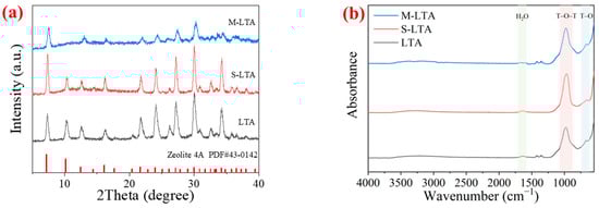 (a) XRD patterns of LTA, M-LTA, S-LTA; (b) FTIR spectra of LTA, M-LTA, S-LTA.
