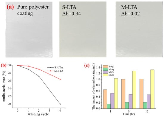 (a) Actual image of pure polyester coating, polyester coating with S-LTA, and polyester coating with M-LTA; (b) Antimicrobial activity of coating film of additives after washing in water; (c) ICP-MS analysis of ions element in solutions by immersing coating panels in deionized water.