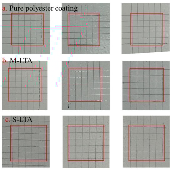 The effect of antimicrobial agents on the mechanical properties of powder-coating films was also investigated. The positive impact and anti-impact test results are illustrated in Figure 4. It can be seen that, regardless of positive or negative impacts, the coating maintains its integrity, and the addition of antibacterial agents does not affect the mechanical properties of the coating. The results of the coating grid test are presented in Figure 5. From the figure, it is observed that after the crosshatch test, the edges of the small squares of the coating remain intact, indicating that both the coatings before and after the addition of M-LTA and S-LTA have good adhesion.