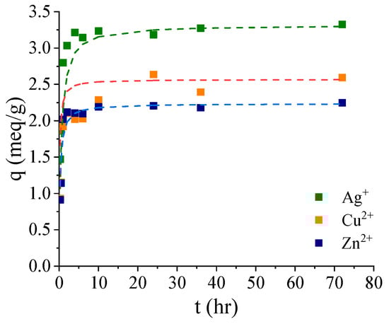 Figure 6 displays the variation in adsorption capacity (q) of Ag+, Cu2+, and Zn2+ over time as observed in ion exchange kinetics testing. The initial adsorption of Ag+, Cu2+, and Zn2+ on the molecular sieve samples occurred rapidly, with most of the experiments reaching 80% equilibrium within 10h. After 10h, the change of metal ion concentration in the solution is negligible. The faster start-up rate is due to the larger driving force caused by the larger solid-liquid concentration difference. As the exchange time increases, the driving force between the solid and the liquid decreases, resulting in a decrease in the adsorption rate. Generally, LTA exhibits a higher selectivity for Ag+ compared to Cu2+ and Zn2+, with the final adsorption capacity for silver surpassing that of copper and zinc. This discrepancy arises due to the high charge of divalent Cu2+ and Zn2+, leading to a reduction in the influx of divalent ions after partial exchange, owing to the influence of Coulombic force. Additionally, the hydrated ion radius of divalent ions is larger than that of monovalent ions, resulting in spatial hinders that impede ion entry.