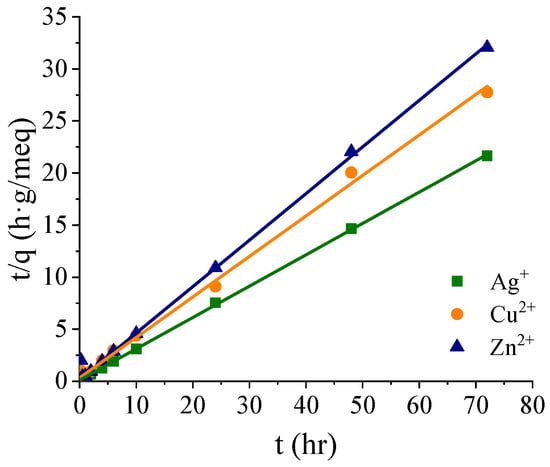 The relationship between t/qt and t is obtained by using Ho et al.’s quasi-second-order equation. Where qe denotes the equilibrium quantity of metal ions (meq/g). qt represents the adsorption quantity of metal ions at time t (meq/g). Notably, k2 denotes the pseudo-second-order kinetic rate (g·meq−1·h−1). This kinetic rate equation reveals LTA adsorption capacity with time. If the equilibrium adsorption capacity and rate constant k2 of the LTA are known, the adsorption capacity at any given moment can be calculated. Figure 7 illustrates the relationship between t/qt and t, and the linear curve is fitted. The pseudo-second-order reaction rate constant k2 and the equilibrium adsorption capacity qe, can be deduced through the intercept and slope. The outcomes of these calculations and correlation coefficient R2 are presented in Table 2. The calculated k value is used to fit the q = qt curve, with the resulting fit shown in Figure 6. This fit is in good agreement with the experimental data. Notably, the R2 values for the three ion exchanges all exceed 0.9, indicating the suitability of the model for describing the solid-liquid adsorption process of LTA. Further analysis reveals that Ag+ ions exhibit a higher exchange capacity qe, while Cu2+ exhibits commendable exchange capacity, albeit with a slower exchange rate. Conversely, Zn2+ demonstrates a modest exchange capacity with a fast exchange rate.
