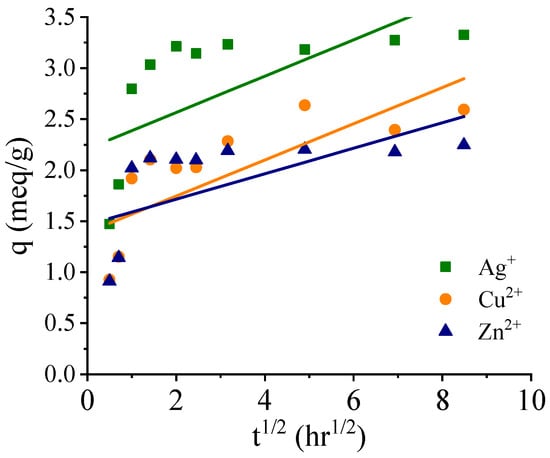 Morris-Weber kinetics model for ion exchange of silver, copper, and zinc.