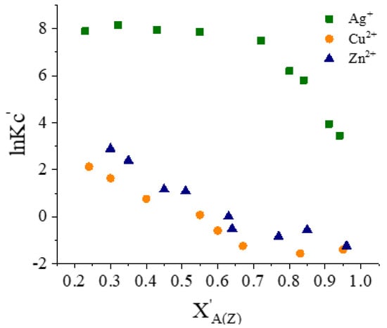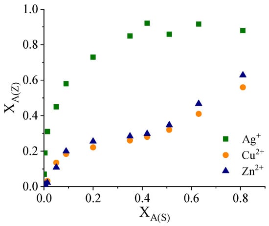 At a given temperature, the equivalent fraction XA(Z) of the ions exchanged in the LTA is plotted against the corresponding fraction XA(S) of the ions exchanged in the solution, and the equilibrium isotherm of the ion exchange can be obtained. The ion exchange isotherms generated during the interchange of internal ions within the molecular sieve with Ag+, Zn2+, and Cu2+ solutions are depicted in Figure 9. Through comparison with the common isotherm types, it can be seen that the Ag+ exchange reaction conforms to Langmuir isotherm, which indicates that adsorption is a single-molecular layer process and the adsorption site is uniform. This means that the ion has a strong interaction with the molecular sieve. Zn2+ and Cu2+ exchange reactions belong to Freundlich isotherm, which indicates that there are multiple layers of adsorption, or that the surface of the molecular sieve is not uniform. This is often the case with complex ions or ions with weak interactions [51]. The silver exchange isotherm is consistently located above the diagonal across the entire compositional spectrum, signifying the LTA’s notably high selectivity for silver. In contrast, in the case of zinc and copper exchange, the isotherm surpasses the diagonal only at low concentrations. Therefore, the selectivity of LTA for zinc and copper mainly depends on the concentration. When silver is completely exchanged, zinc and copper are partially exchanged.