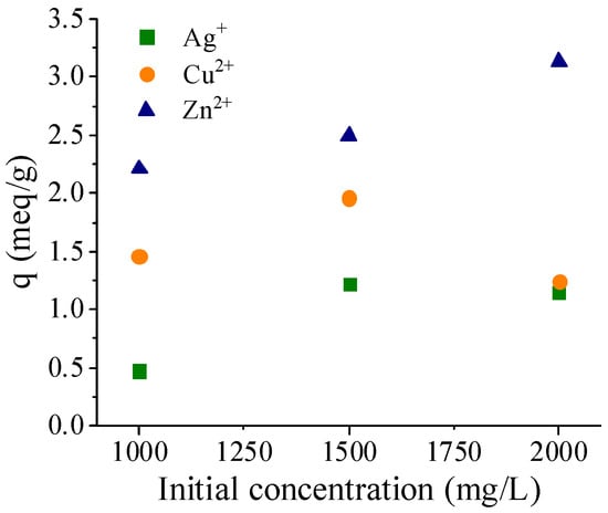 The relevant research data on the adsorption of Ag+, Cu2+, and Zn2+ by molecular sieve are shown in Table 3. These studies did not compare the adsorption of the ions in the Ag+, Cu2+, and Zn2+ ions. Under this study’s conditions, the adsorption efficiencies of LTA for Ag+, Cu2+, and Zn2+ were 72%, 40%, and 24%, respectively. The η can be calculated as: