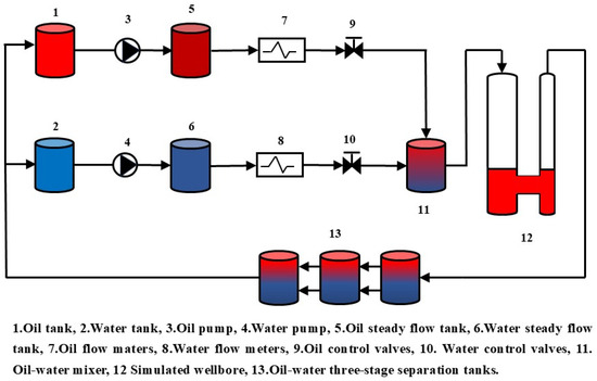 The simulation experiment of oil–water two-phase flow was performed by applying the multiphase flow simulation experimental platform for horizontal and severely deviated wells at Yangtze University, as seen in Figure 1.