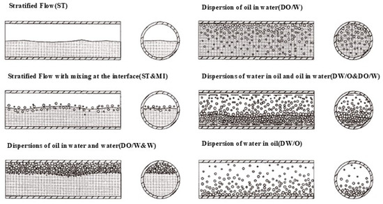 The complexity and polymorphism of horizontal oil–water two-phase flow patterns necessitate the precise identification of flow regime transition boundaries, which is crucial for the analysis of two-phase flow models. Trallero et al. [19] conducted experimental and theoretical studies on oil–water two-phase flow regimes in horizontal wells, dividing the flow regimes into two primary categories: segregated flow and dispersed flow. Segregated flow encompasses stratified flow (ST) and stratified flow with a mixed interface (ST&MI). Dispersed flow encompasses several flow regimes: oil dispersed in water in the upper layer with water in the lower layer (DO/W&W), water dispersed in oil in the upper layer with oil in the lower layer (DW/O&DO/W), dispersed oil-in-water flow (DO/W), and dispersed water-in-oil flow (DW/O), as illustrated in Figure 3.
