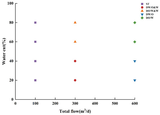 This experiment recorded and organized the oil–water two-phase flow patterns under varying total flow and water cuts, as presented in Table 2. A flow pattern diagram of oil–water two-phase flow in horizontal wells has been developed, as shown in Figure 4.