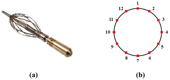 The Resistivity Array Tool (RAT) comprises a main body rod and 12 retractable bow-spring support arms, as shown in Figure 5a. Each arm contains a miniature sensor that is uniformly and accurately positioned along the inner surface of the wellbore, as depicted in Figure 5b. Each sensor generates independent response data contingent upon the specific fluid conditions present at its location. This multipoint configuration effectively captures variations in water holdup across various regions, illustrating the oil–water distribution patterns within the wellbore. As the tool traverses constricted areas of the well, the bow springs retract to facilitate unobstructed movement. Upon entering regions with larger casing cross-sections, the spring arms expand automatically, applying pressure to the sensors against the wellbore wall to gather fluid resistivity data from various positions.