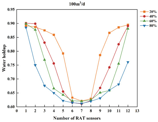Local water holdup of RAT sensors when the total flow is 100 m3/d.