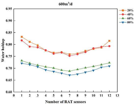 Local water holdup of RAT sensors when the total flow is 600 m3/d.