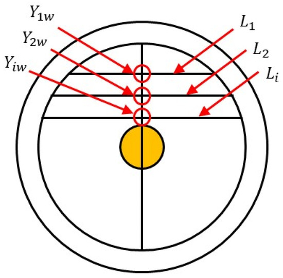 The cross-section of a simulated wellbore can be represented as a two-dimensional coordinate system, with the coordinates of a sensor on the cross-section denoted as and those of a target . The water holdup of oil–water two-phase flow within the wellbore cross-section can be calculated using the formula derived from the sensor response data from the RAT.