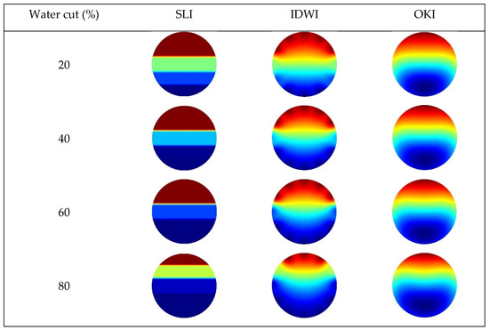 This research examines the imaging results of the SLI, IDWI, and OKI algorithms across various experimental conditions. Figure 13, Figure 14 and Figure 15 illustrate the imaging results obtained from the three interpolation algorithms applied to the wellbore cross-section, considering the instruments’ positions within the wellbore. The images demonstrate the distribution of water holdup within the wellbore, providing a visual representation of how the relative positioning of instruments and fluids affects the imaging results. Furthermore, the imaging effects that do not account for instrument positions are presented, demonstrating that in these imaging diagrams, the algorithms depend exclusively on fluid distribution characteristics and interpolation methods, overlooking the influence of the instruments’ actual locations on the fluid distribution data, as illustrated in Figure 16, Figure 17 and Figure 18. In complex multiphase flow conditions, different interpolation algorithms exhibit distinct capabilities in capturing fluid distribution characteristics within the wellbore, offering valuable insights for selecting methods for fluid distribution imaging and water holdup calculations. In this study, two important assumptions are made: The impact of emulsions on the measurement is negligible, and the slip effect is insignificant.