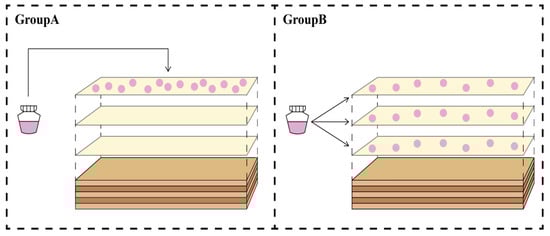 The mixing of the lavender fragrance microcapsules with the topcoat is divided into two groups (Group A and Group B). In Group A, the microcapsules are added only to the final coat, with concentrations of 3%, 6%, and 9% of the total mixture. In Group B, the microcapsules are evenly mixed into all three topcoat layers, ensuring that the total amount added is the same as in Group A. This process results in six groups of fragrance-releasing flooring samples with varying microcapsule concentrations, as shown in Figure 1 and Table 1. A conventional flooring sample without lavender microcapsules is used as a control to evaluate the impact of microcapsule addition on the physical and chemical properties of the flooring.