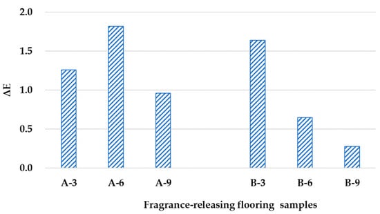 A Konica Minolta CR-10 Plus colorimeter (Konica Minolta Co., Tokyo, Japan) was used to measure the color of both the control group and the fragrance-releasing flooring under a D65 light source. For each group, 10 points on the surface of the test specimens were measured, and the average value was calculated. The CIE (1976) Lab* color space system was used for color analysis. In this system, L* represents the lightness index, a* represents the red–green index, and b* represents the yellow–blue index. The color difference (ΔE) was calculated using the following formulas: