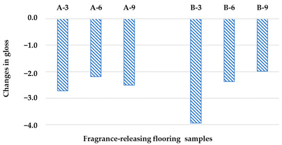 Glossiness, as detailed in Table 3 and Figure 4, also showed significant variation due to both factors (p < 0.005). Process B, in particular, led to the most noticeable reduction in gloss, with the B-3 sample experiencing a drop exceeding 3 units. This reduction, although measurable, remains relatively small, with all samples showing an overall gloss reduction of less than 4%, which is minimal and unlikely to be perceptible to the average consumer. In terms of perceptibility, a gloss reduction of this magnitude would likely be described as very subtle, and would not significantly impact the visual appeal or overall esthetic of the flooring.