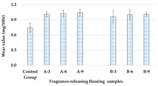 Figure 5 presents the wear resistance results, measured as wear values in mg per 100 cycles. While all samples exhibited some degree of wear, the differences between them were minimal. The control group showed the lowest wear value, indicating the highest resistance to wear. However, the samples with microcapsule additions—particularly A-3, A-6, and B-3—demonstrated slightly higher wear values, approximately 1 mg/100 cycles. This suggests that while the introduction of lavender microcapsules slightly impacts wear resistance, it does not significantly diminish the overall durability of the flooring. The error bars further indicate minimal variation across samples, reinforcing the conclusion that the fragrance-releasing feature does not lead to substantial wear issues [23].