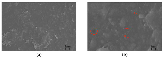 Figure 6a,b depict the surface morphology of conventional flooring and fragrance-releasing flooring, respectively. In the absence of microcapsules in the surface coating, the flooring appears relatively smooth and even. However, when magnified 10,000 times, localized irregularities and granular structures become visible. In contrast, the surface of the fragrance-releasing flooring displays numerous uniformly distributed core–shell structures (as indicated by the arrows) [25]. Additionally, a pore, marked by a circle, was observed, which may have formed due to capsule breakage during storage, causing the release of lavender fragrance. Scanning electron microscopy (SEM) results confirm that the microcapsules are evenly dispersed within the surface coating, and their core–shell structures remain intact throughout the flooring production process.