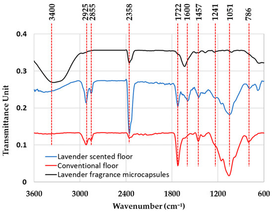 FT-IR spectra of lavender fragrance microcapsules, conventional flooring, and fragrance-releasing flooring.