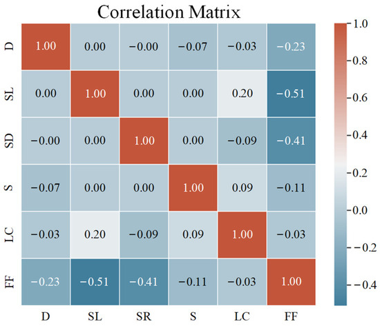 Figure 6 provides insights into the correlations and relationships among the variables D (depth), SL (side length), SR (surface ratio), S (shape), LC (load-carrying capacity), and FF (friction force). The heat map visualizes the pairwise correlations between variables, with darker shades indicating stronger positive (blue) or negative (red) correlations, while lighter shades signify weaker correlations. The matrix reveals several notable patterns and findings that shed light on the intricate interplay between these parameters in the context of the studied system. Each cell within the matrix denotes the correlation strength between two variables, with values ranging from −1 to 1. A value of 1 signifies a robust positive correlation, −1 indicates a pronounced negative correlation, and 0 signifies an absence of correlation.