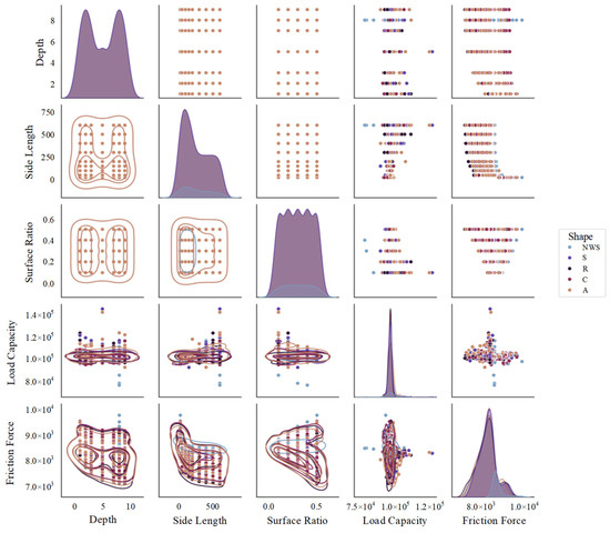 Examining the relationships between design parameters and performance metrics reveals interesting patterns. Both depth and side length showed a positive correlation with load-carrying capacity, indicating that increasing the depth and the side length of the structure generally enhanced its load-bearing capabilities. However, the relationship between depth and friction force was less pronounced, suggesting that depth alone may not be a strong predictor of frictional behavior. Conversely, the surface ratio parameter showed a negative correlation with load-carrying capacity, suggesting that higher surface ratios may compromise the structure’s ability to support loads effectively. Interestingly, the friction force metric displayed a wide range of values across different shapes and design parameters. The geometric shapes tended to have lower friction force values compared to the non-woven structure, indicating its inherent suitability to sliding and potential for decreased surface interactions. Among the geometric shapes, the aperture structure exhibited the highest variability in friction force, highlighting the complex interplay between aperture design and frictional properties. The pair plot also reveals the presence of outliers and extreme values, particularly in the load-carrying capacity and friction force metrics. These outliers suggest the existence of specific design configurations or manufacturing conditions that result in exceptional performance characteristics. Further investigation into these outliers could yield valuable insights into optimizing the design and production process for enhanced mechanical properties.