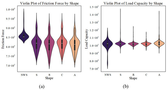 Figure 8a that the woven structure shapes (square, rectangle, circle, and aperture) generally exhibited lower friction force values compared to the non-woven structure, which displayed a compact and dense distribution with a higher median friction force value. In contrast, the woven structure shapes demonstrated broader distributions of friction force values, generally shifted towards lower magnitudes. This suggests that the woven structures, particularly the geometric shapes, possessed inherent characteristics that contributed to reduced frictional properties. The observation of a wider range of frictional behaviors within each category of woven shapes indicates the potential for further optimization of these structures in order to minimize friction forces. These findings highlight the advantageous tribological properties of woven textures, particularly their ability to reduce surface interactions and promote easier sliding, which is desirable in many applications requiring low friction. The aperture and rectangle shape demonstrated the most pronounced lower tail, implying its potential for achieving reduced frictional properties. On the other hand, the load-carrying capacity violin plot revealed distinct differences in the load-bearing capabilities of the various shapes, as shown in