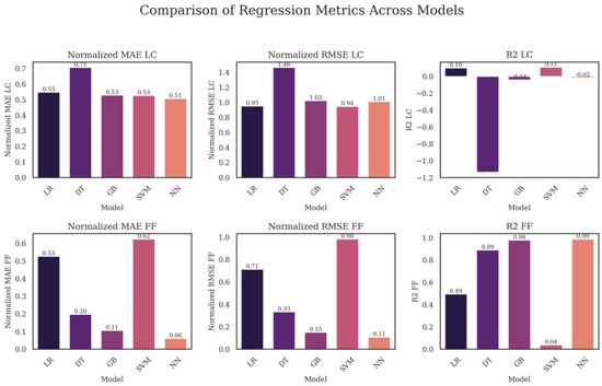 Table 5 present a comparative analysis of the performance of LR, DT, GB, SVM, and NN) in predicting a target variable. The optimal values of the corresponding evaluation indicators under different methods are presented in the table in black. In order to facilitate a more intuitive comparison and analysis of the performance of the predictor variables, this paper plotted (