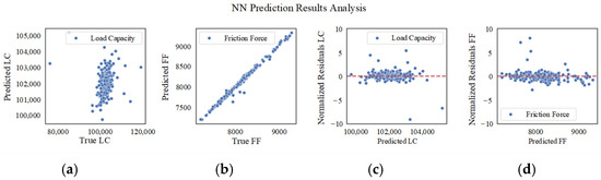 Figure 10c exhibit a wider spread compared to the friction force residuals. This suggests that the NN model’s predictions of load-carrying capacity had higher variability or uncertainty compared to its predictions of friction force. Nevertheless, the overall magnitude of the load-carrying capacity residuals remained small, with the majority falling within the range of −2–2, indicating that the model still provided reliable and accurate predictions. The normalized residuals plot provides further validation of the NN model’s performance.