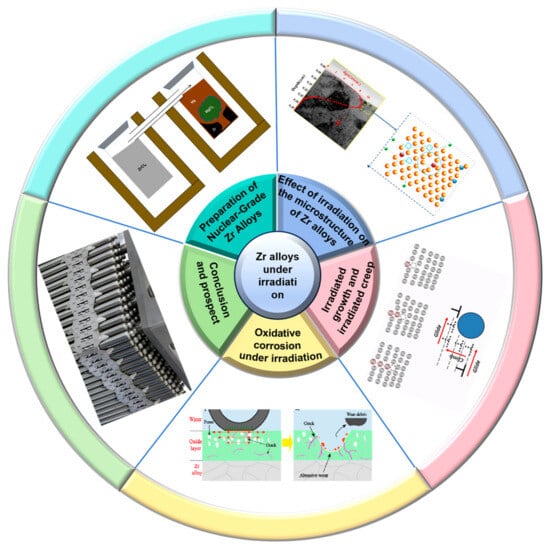 The structure of this review is illustrated in Figure 1. Firstly, an overview of the preparation process of nuclear-grade Zr alloys is provided, followed by a description of the transformation of the microstructure of Zr alloys under irradiation. Subsequently, the discussion will proceed to examine irradiated Zr alloys in greater detail and in a systematic manner, beginning with an analysis of the microstructure and progressing to an investigation of macrodeformation. Furthermore, the particular phenomenon of oxidative corrosion under irradiation is presented in summary form. In conclusion, the findings of the comprehensive review and summary are used to discuss the prospective developments and future research directions of Zr alloys under irradiation.