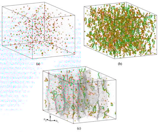 CRA simulations were performed using the MA1 potential of 10 M atoms to calculate the dislocation microstructure. Green, orange and red dislocations indicate <20>, <100> and Burgers-type vectors, respectively. The points are self-interstitial atoms determined by the Wigner–Seitz analysis, and the boundaries of the interstitial clusters are rendered as transparent surfaces. (a) At very low doses of 0.02 dPa, autologous intervals are defective and small dislocation loops. (b) Dense dislocation network at a low dose of 0.13 dPa. (c) Extended dislocation network at high doses of 2.00 dPa with infiltration gap masses [4] (Reproduced with permission from Elsevier, Amsterdam, The Netherlands).