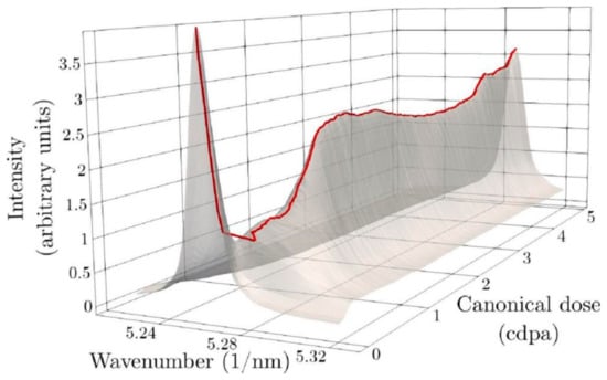 Simulation of the {102} X-ray diffraction peak as a function of dose. The red path highlights changes in peak intensity and its centre shift. The dislocation density is saturated with the change of dose, which is close to the limit value of 1015 m−2 [4] (Reproduced with permission from Elsevier, Amsterdam, The Netherlands).