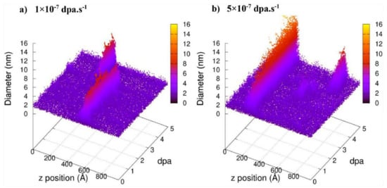Evolution of the diameter of the interstitial loop (a) as a function of radiation dose for a flux of 1 × 10−7 dpa·s−1 and (b) for a flux of 5 × 10−7 dpa·s−1 [5] (Reproduced with permission from Elsevier, Amsterdam, The Netherlands).
