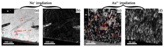 BF map of the c ring in Zr-0.6Fe under <c> (a) Ne+ irradiation and (c) Au3+ irradiation. The imaging g vector is orientated at 0002 near the {110} region axis, and the red arrow indicates the direction of g = 0002. (b,d) DF figures correspond to (a,c) [6] (Reproduced with permission from Elsevier, Amsterdam, The Netherlands).