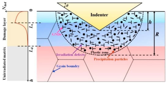 In the illustration of NIT of Zr-Fe alloy under ion irradiation, the plastic zone is considered as a hemisphere with radius R. Lt and Ld denote the critical penetration depths located at the peak and maximum irradiated layers, respectively. h is the indentation depth, and θ is the angle between the indenter surface and the sample [6] (Reproduced with permission from Elsevier, Amsterdam, The Netherlands).